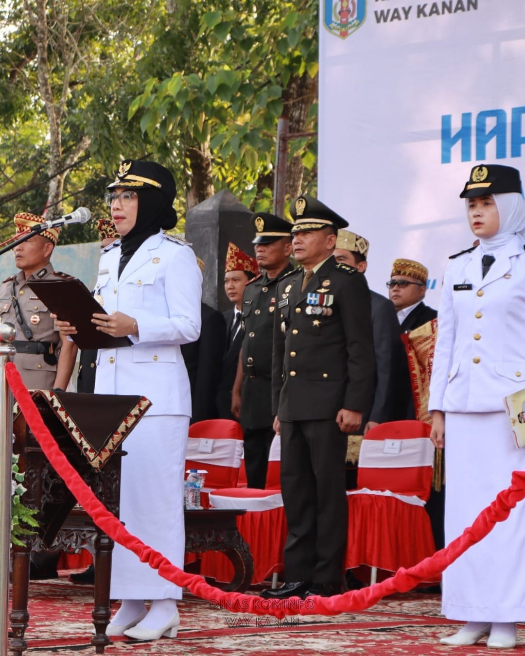 Bertindak sebagai Inspektur Upacara, Pelaksana Tugas (Plt.) Bupati Ayu Asalasiyah, S.Ked., menegaskan pentingnya momentum ini sebagai refleksi perjalanan panjang Way Kanan dalam mewujudkan kemajuan daerah, Senin (28/04/2025).