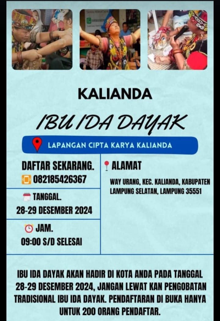 LAMPUNG SELATAN – Pamplet atau Brosur beredar di medsos bahwa pada Hari Sabtu Tangggal 28 hingga 29 Desember bertempat dilapangan Cipta Karya Kecamatan Kalianda Kabupaten Lampung Selatan akan di lakukan praktek pengobatan tradisional dengan mengatas namakan Ida Dayak.