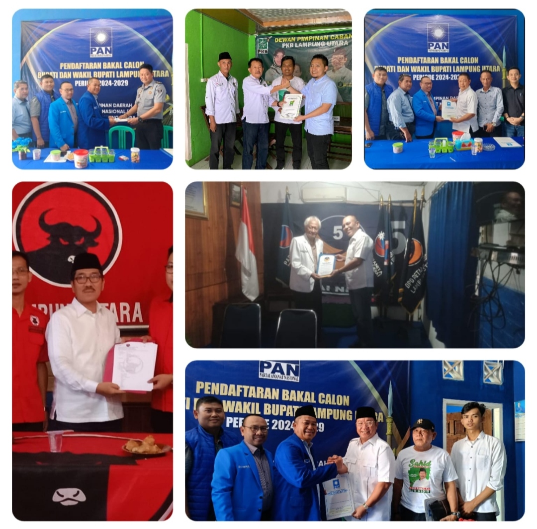 LAMPUNG UTARA-Bakal calon kepala daerah (Bacakada) Kabupaten Lampung Utara mulai mengembalikan berkas formulir pendaftaran di sejumlah partai politik, Senin (06/05/2024).