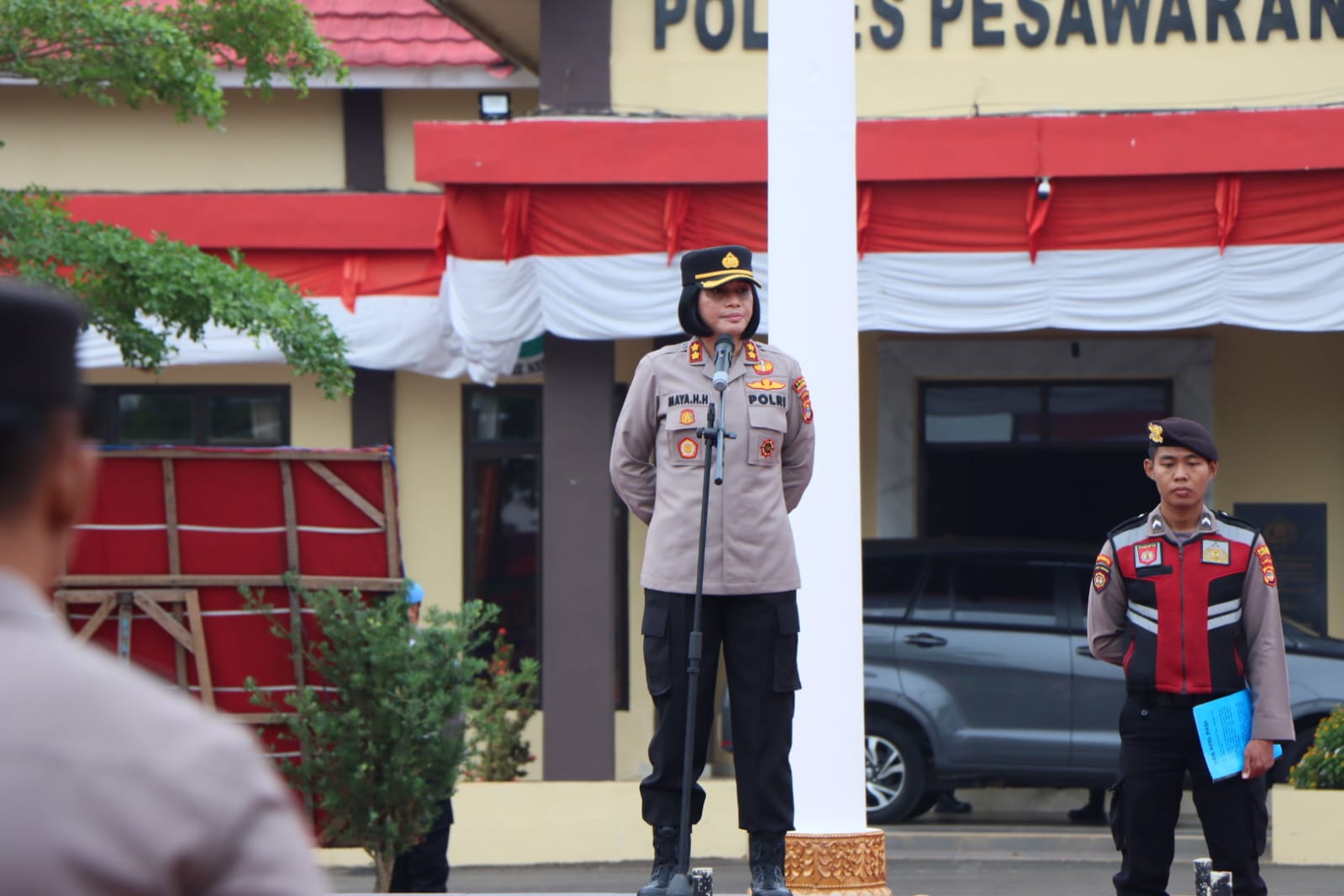 PESAWARAN – Kepala Kepolisian Resort (Kapolres) Pesawaran AKBP Maya Henny Hitijahubessy, S.H., S.I.K., M.M memimpin apel pagi perdana di lapangan Mapolres Pesawaran, Rabu (02/08/2023)