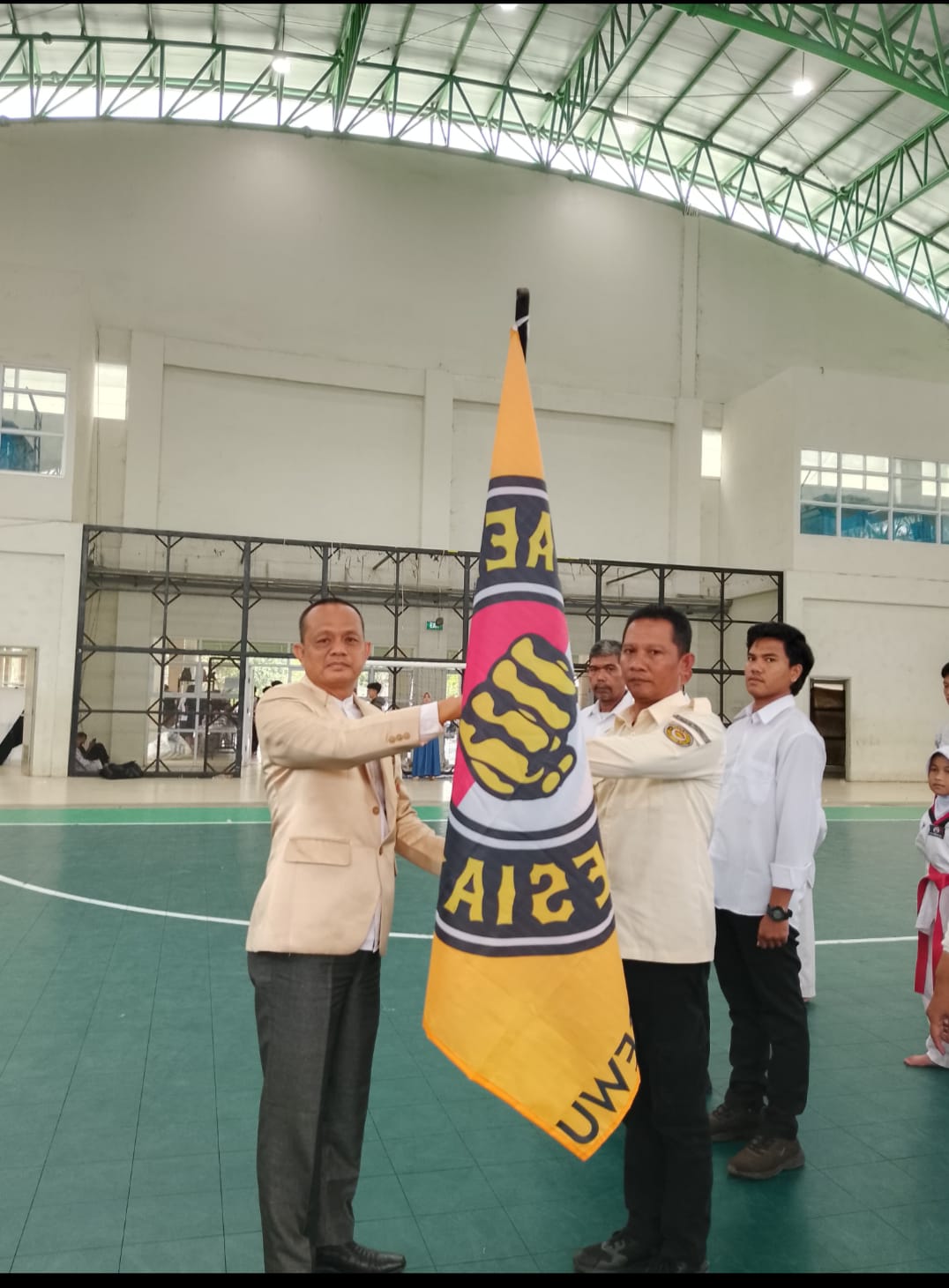 Ketua Pengprov TI Lampung Heliandri, S. Sos menyerahkan Bendera Petaka dan SK kepada Irwan Prianto, S.H sebagai tanda kepengurusan Pengkab TI Pringsewu resmi dilantik.