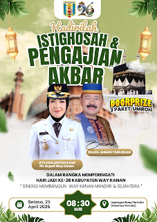 Acara peringatan Hari Ulang Tahun (HUT) ke 26 tersebut mengambil tema ‘Sinergi membangun Way Kanan, Mandiri dan sejahtera’, akan digelar tanggal 27 sampai dengan tanggal 29 April 2025. Dalam acara istighosah dan pengajian akbar serta jalan sehat tersebut disiapkan hadiah doorprize menarik, yaitu diantaranya 1000 vocher makan dan minuman gratis, perlengkapan elektronik dan sepeda, dan 3 paket Umroh.