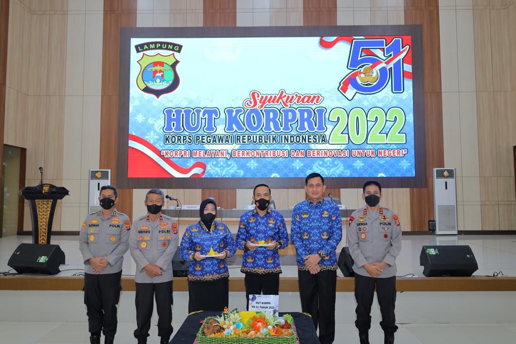 Acara syukuran HUT Korpri ke-51 tahun 2022 Polda Lampung mengusung tema ‘Korpri melayani, berkontribusi dan berinovasi untuk Negeri’ turut dihadiri oleh Irwasda Polda Lampung Kombes Pol Sustri Bagus Setiawan, Pejabat Utama, dan diikuti oleh PNS Polri jajaran Polda Lampung sejumlah 141 orang.