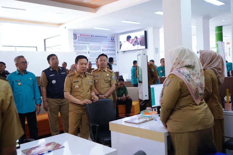 Didampingi inspektur dan kepala perangkat daerah penyelenggara pelayanan publik, Pj Bupati Pringsewu, Marindo Kurniawan melakukan peninjauan pelaksanaan pelayanan publik di Mal Pelayanan Publik Kabupaten Peingsewu.
