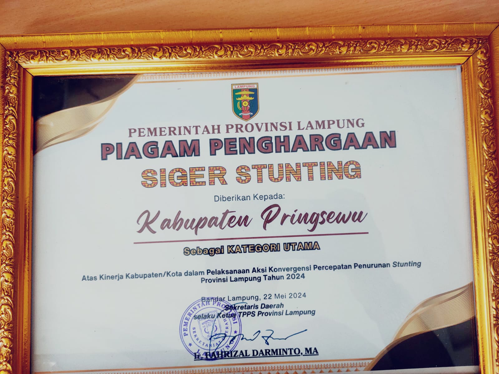 Atas prestasi tersebut, Pemkab Pringsewu mendapat Piagam Penghargaan dari Pemerintah Provinsi Lampung serta Penghargaan Siger Stunting Kategori Utama, yang diterima oleh Kepala Bappeda Pringsewu Imam Santiko Raharjo, mewakili Pj. Bupati Pringsewu Marindo Kurniawan di Bandarlampung, Rabu (22/05/2024).
