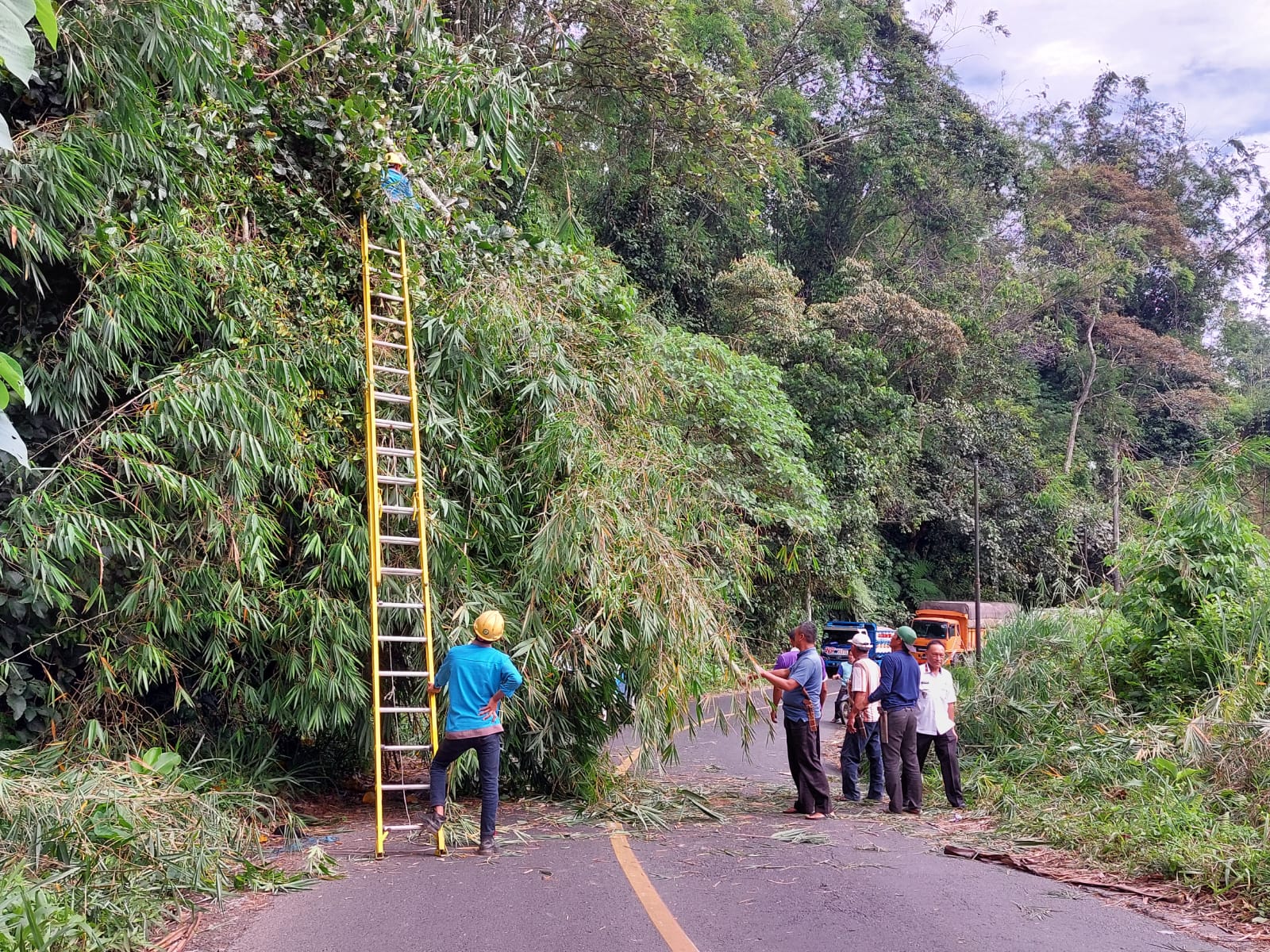 “Saat ini masyarakat masih berupaya membersihkan serpihan bambu menggunakan alat seadanya dibantu oleh pihak PLN dan juga pengendara yang melintas, sebab hingga saat ini hanya kendaraan roda empat dan roda dua yang bisa melintas secara bergantian,” kata salah warga yang ikut membersihkan pohon bambu yang tumbang, Rabu (8/2/2023).