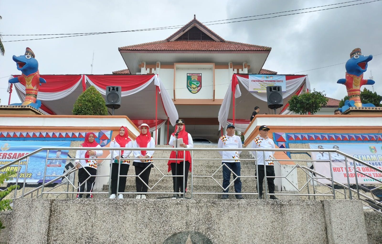 SIRLAMPUNG, TANGGAMUS – Bupati Tanggamus Hj. Dewi handajani SE. MM menghadiri dan Ikut Senam Bersama dalam rangka HUT Ke-51 KORPRI dan HUT ke 23 DWP Kabupaten Tanggamus tahun 2022 yg di laksanakan di Lapangan Upacara Pemerintah Kabupaten Tanggamus Jum’at (2/12/2022).